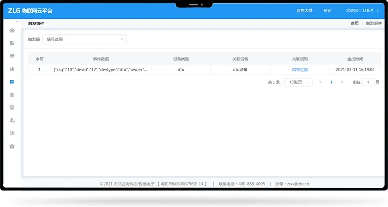 针对充电桩、电力系统、污水处理等行业设备,通过串口与DTU设备连接,再通过4G连接到ZWS云端,即可远程监控DTU与数据中心的连接情况(在线、断线趋势),也可以根据用户的解析脚本,将业务数据解析显示在ZWS云端。