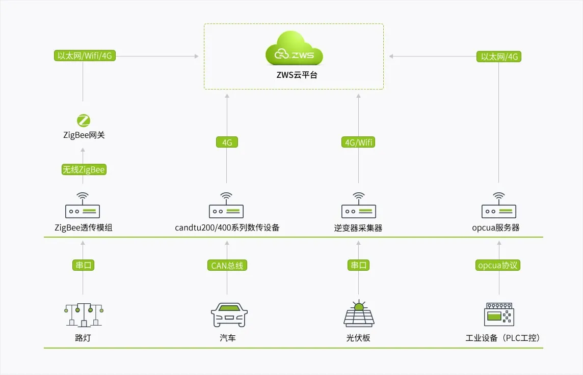 ZWS云平台支持多种协议设备硬件接入,包括ZigBee、LoRaWAN、opcua、modbus等协议,同时,支持对通信硬件远程配置、远程控制、远程升级等管理。
